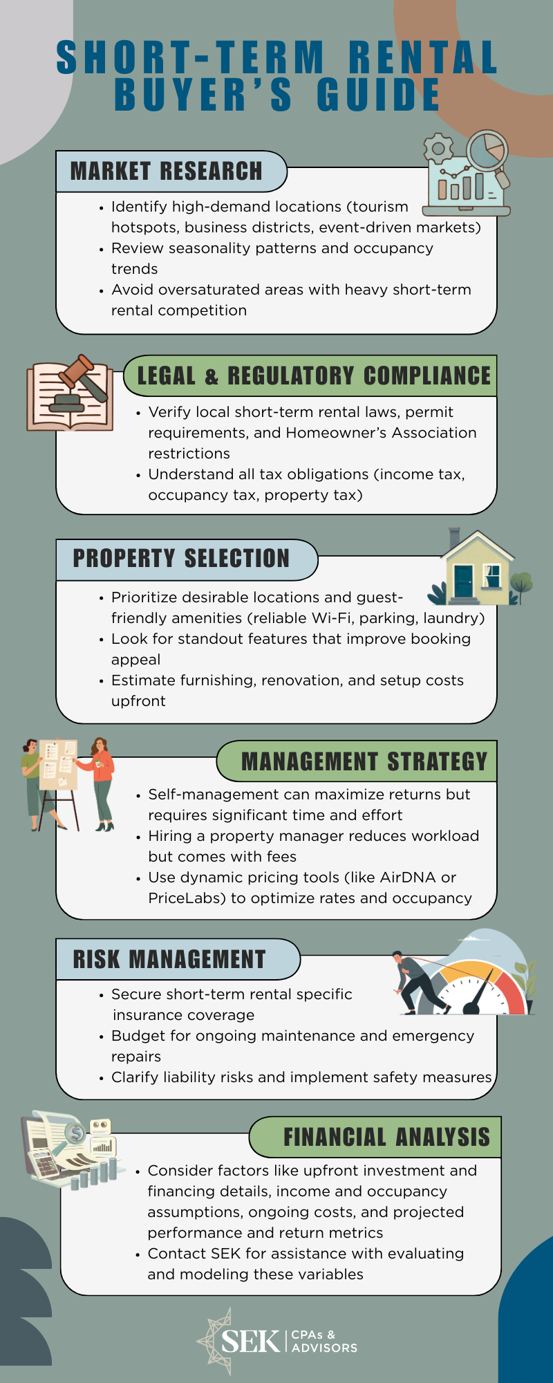 Our Short-Term Rental Buyer’s Guide covers the essentials – market demand, local rules and taxes, property and setup considerations, management approach, risk planning, and financial analysis – to give you a clear picture of your investment.